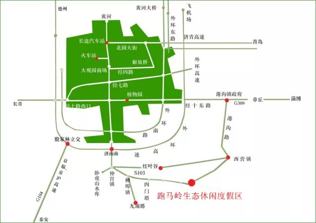 2、經十路或旅游路行至港西路路口,沿港西路南行至西營鎮,沿老柳線走盤山路至濟南跑馬嶺生態休閑度假區。