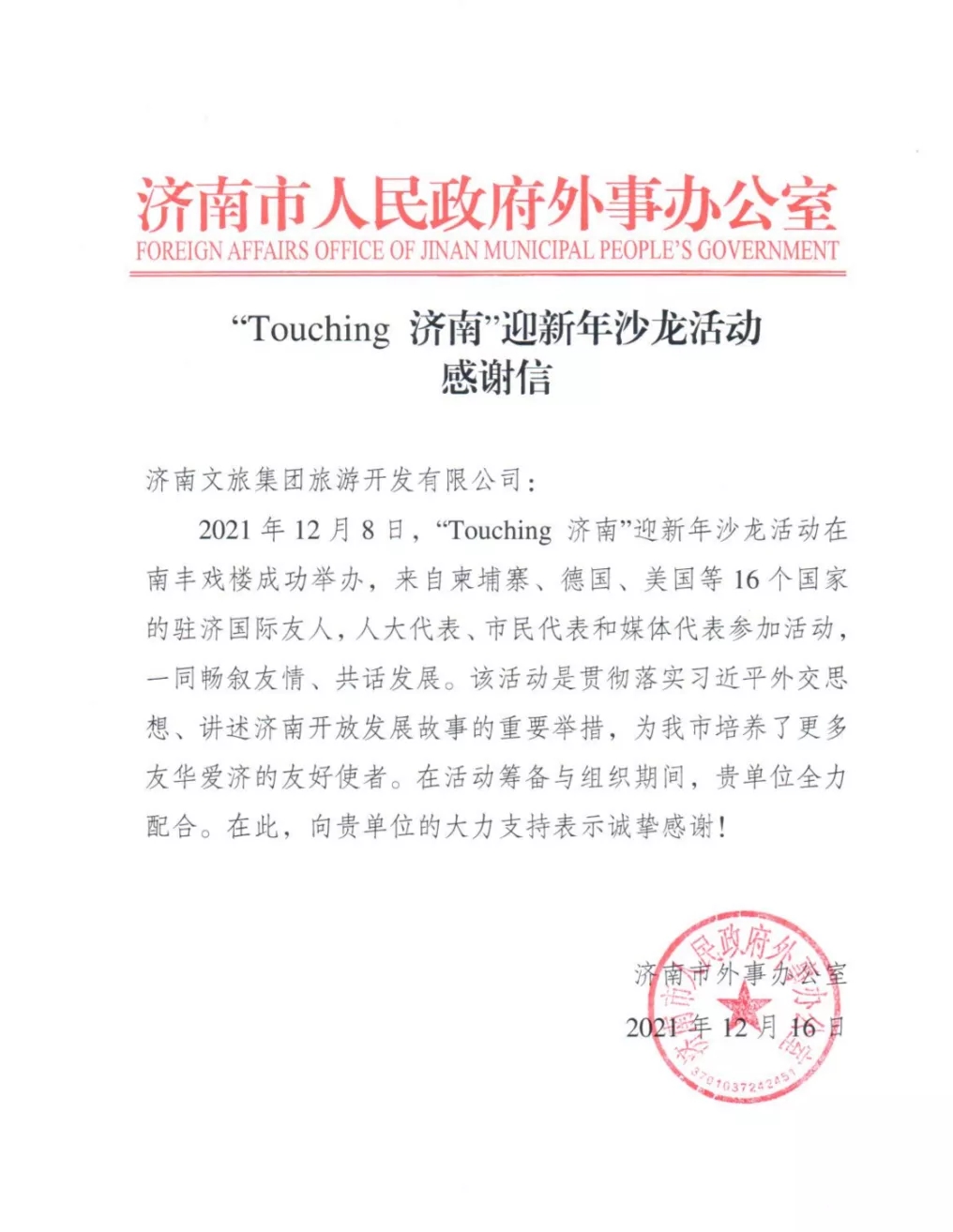 16日,活動(dòng)圓滿結(jié)束后,旅游開發(fā)公司獲得了市外事辦公室的感謝與肯定。