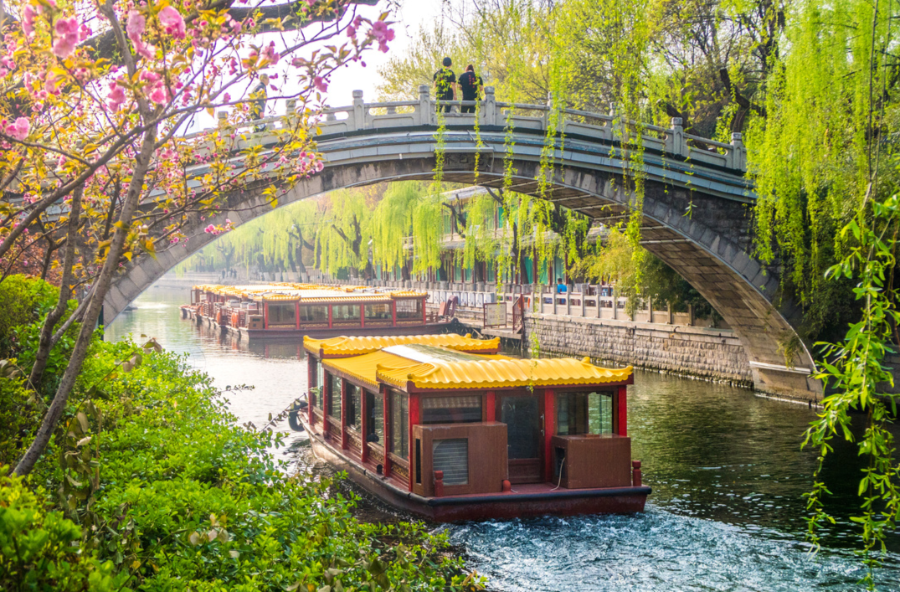 品味濟(jì)南護(hù)城河的美,單單在河邊遠(yuǎn)觀近賞是不夠的。最妙的是乘船暢游,觀翩翩垂楊,聽潺潺泉韻。