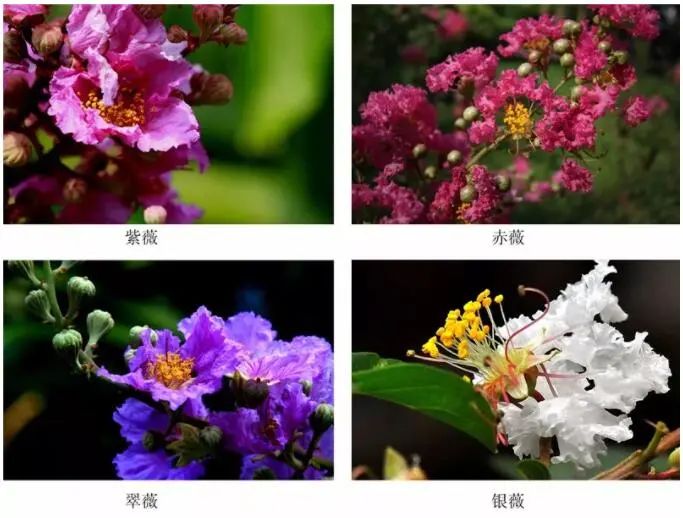 紫薇雖名為“紫薇”,可不僅僅只有紫色。根據花色的不同,紫薇可分為四個品系:紫薇、翠薇、赤薇、銀薇,顧名思義,花色分別為紫紅、藍紫、火紅、白色。