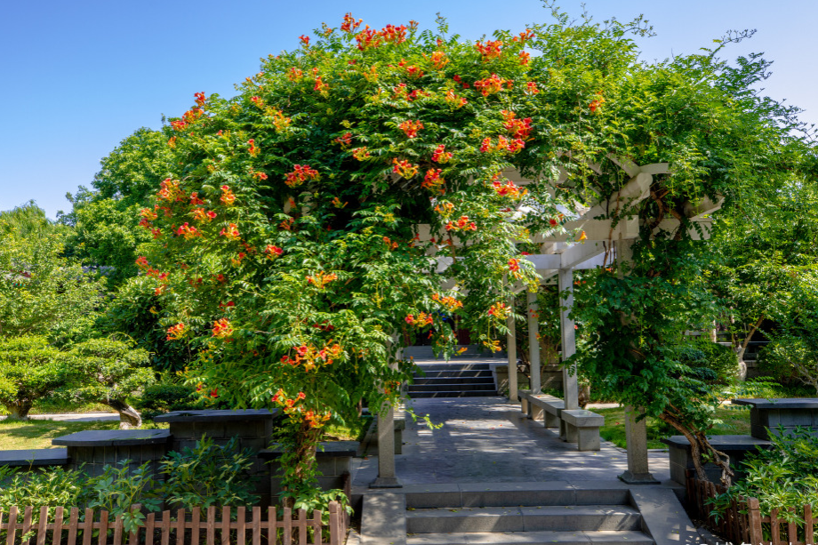 凌霄花不僅觀賞性強,還是一味傳統的中藥材,有涼血化瘀、行血祛風、解毒消腫等功效。