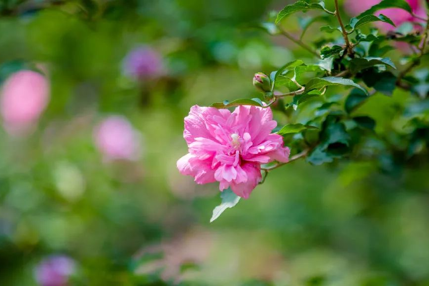 木槿朝開暮落,雖然每朵花都只有一天盛放的時間,但是花期非常持久。因此木槿又叫朝開暮落花、無窮花。