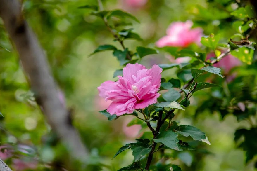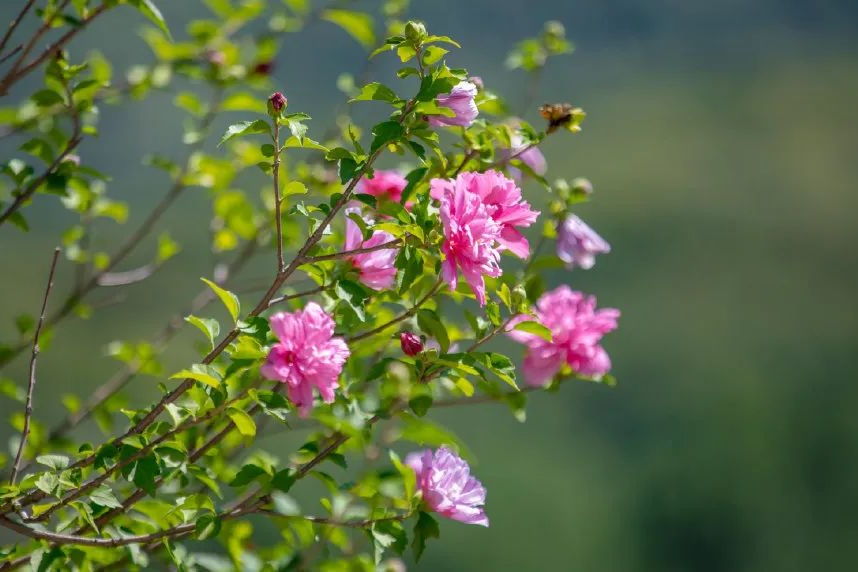 6月中下旬,濟南的木槿花開始盛開,精致艷麗,被茂盛碧綠的葉子襯托著,分外嬌艷。