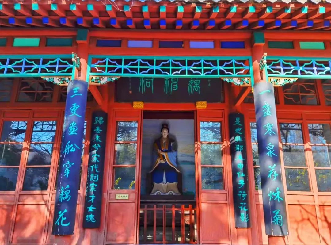 門口是濟南著名文化學者徐北文先生所作的祠聯:“是耶非耶,水中仙子荷花影;歸去來兮,宋代詞宗才女魂。”由此可知,“藕神”正是“詞宗才女”李清照。