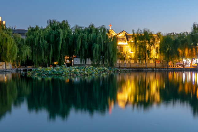 老城密布著大大小小一百多處天然甘泉,匯流成的護(hù)城河流淌到大明湖,與周圍的千佛山、鵲山、華山等構(gòu)成了獨(dú)特的風(fēng)光,自古就有“家家泉水,戶戶垂楊”“四面荷花三面柳,一城山色半城湖”的美譽(yù)。