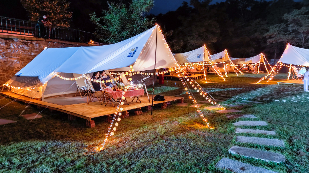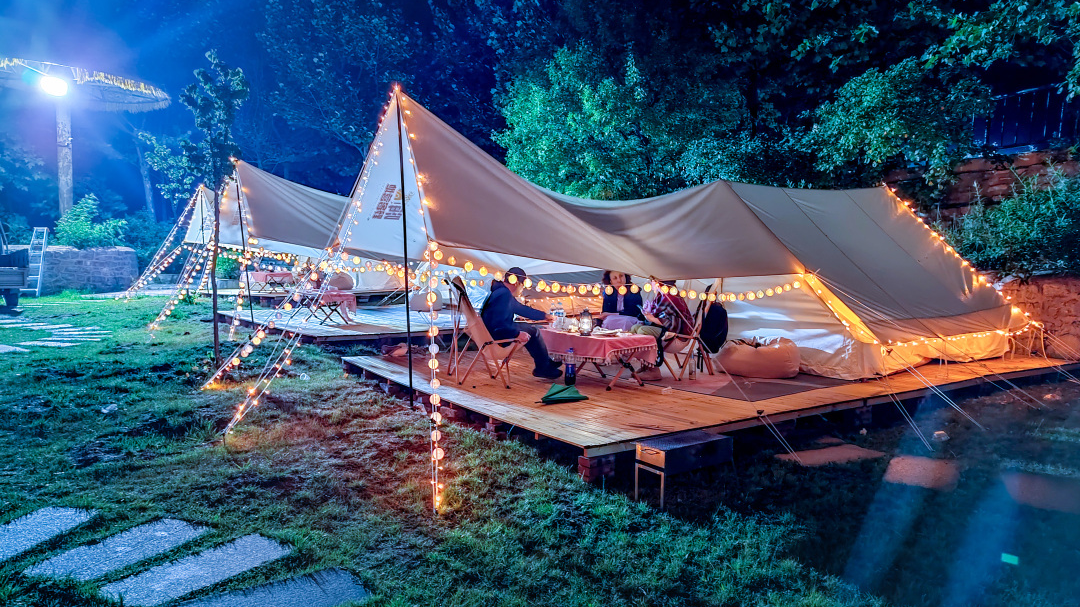 跟三五好友坐在搭好的帳篷里,看星光點(diǎn)點(diǎn),云卷云舒,讓清新的空氣給好心情加一點(diǎn)糖分。在這樣的靜謐空間里享受舒適和安寧,你的心變得無比寧?kù)o,睡意徐來,晚安。