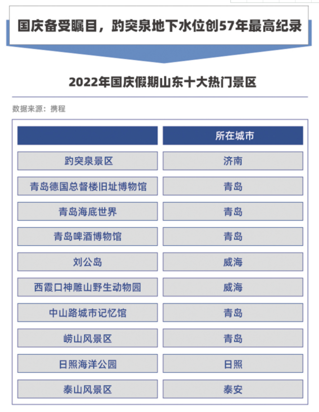 在剛剛過去的國慶假期,最受矚目的景點在哪里?近日,攜程發布的“2022年國慶假期山東十大熱門景區”,濟南趵突泉榮登榜首。