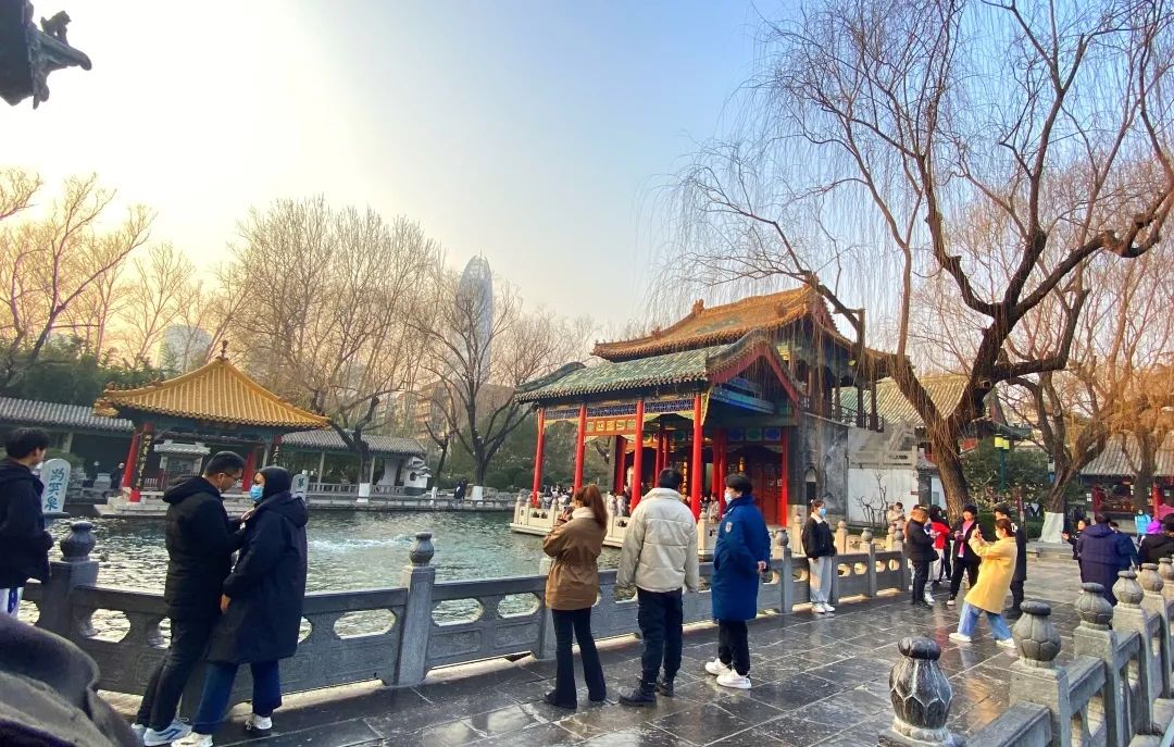 在趵突泉畔,許多家庭趁著溫暖的天氣出行,在冬日暖陽的照耀下,趵突泉公園如同一幅徐徐展開的多彩畫卷,與那不斷噴涌、永不疲乏、永不退縮的泉水共同開啟新的一年。