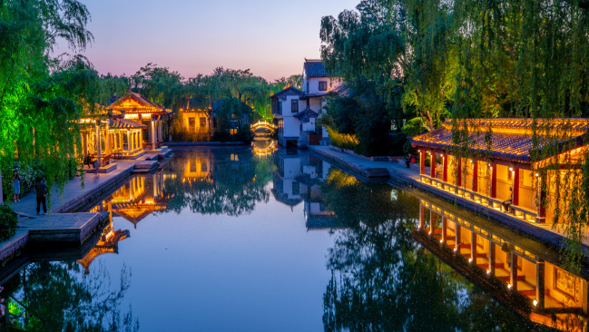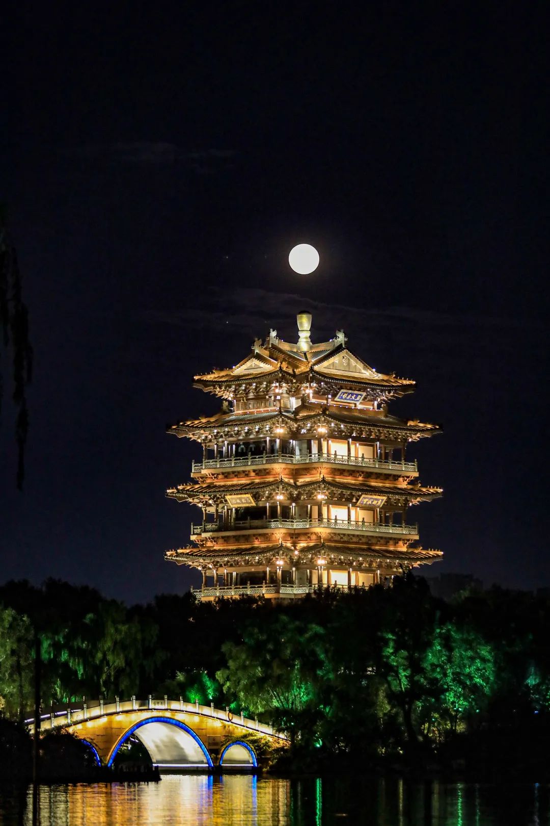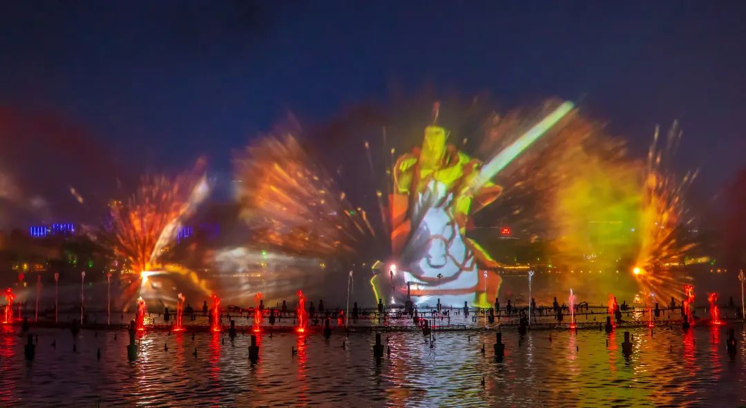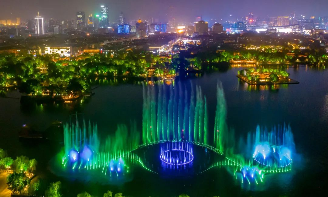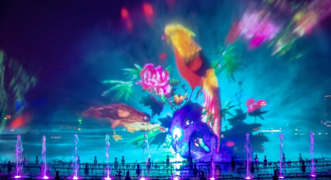 噴泉、月屏、浮臺(tái)在夜色中交相輝映