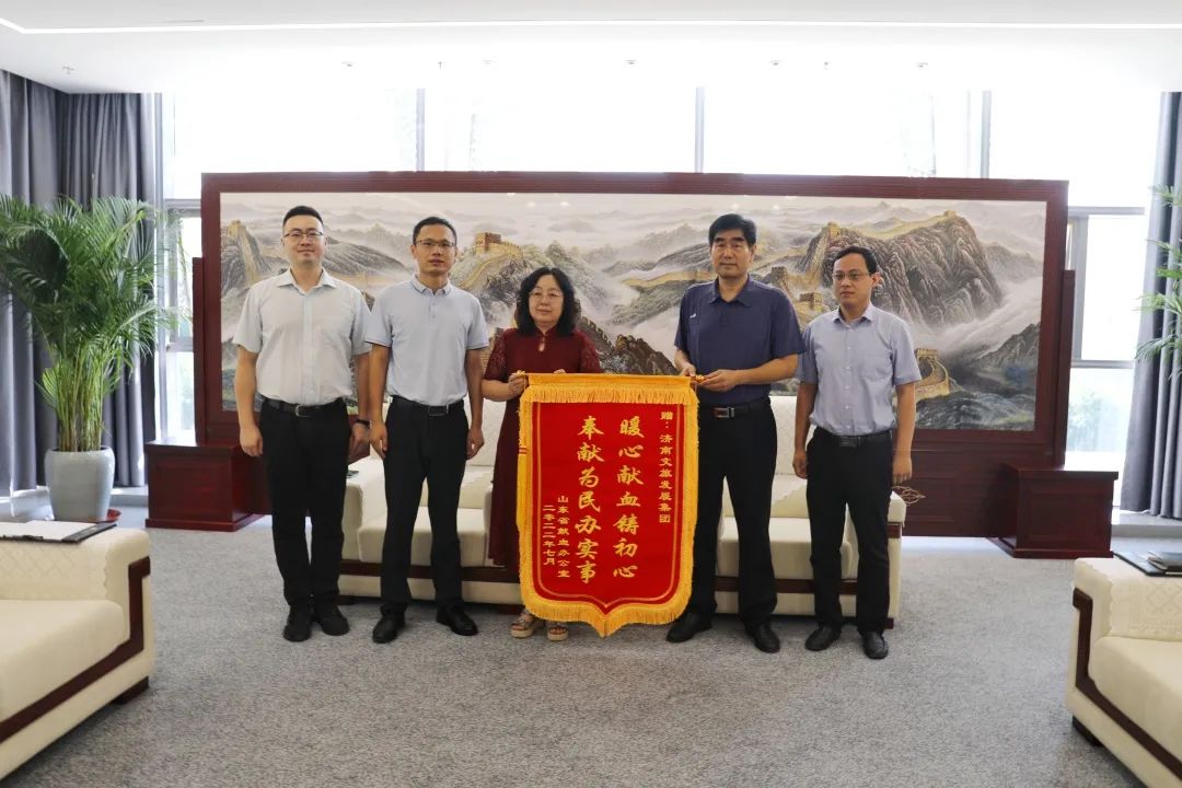 獻血活動之前,山東省血液中心向濟南文旅集團頒發(fā)錦旗,對集團關心獻血公益事業(yè)所作的貢獻表示感謝。