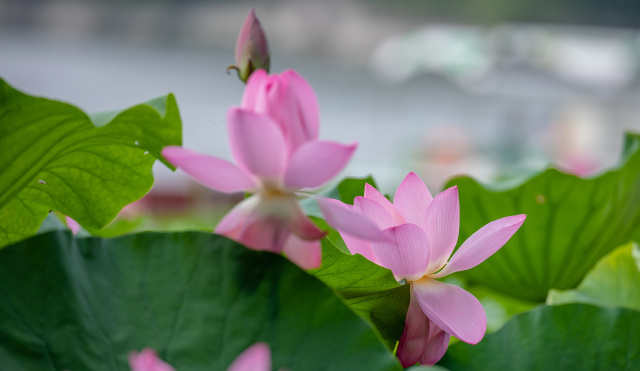 粉紅的荷花與綠葉相依