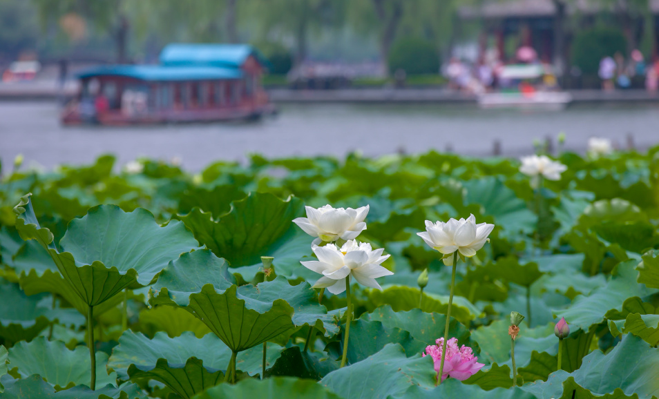 游船在湖面上穿梭