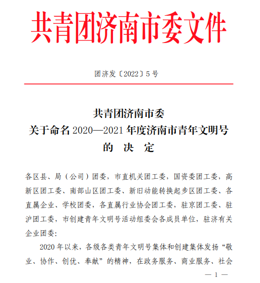 近日,共青團濟南市委下發(fā)《關(guān)于命名2020—2021年度濟南市青年文明號的決定》,濟南文旅集團旅游開發(fā)有限公司明湖秀班組和濟南野生動物世界有限公司乘車游覽區(qū)飼養(yǎng)班組榮獲2020-2021年度“濟南市青年文明號”榮譽稱號。