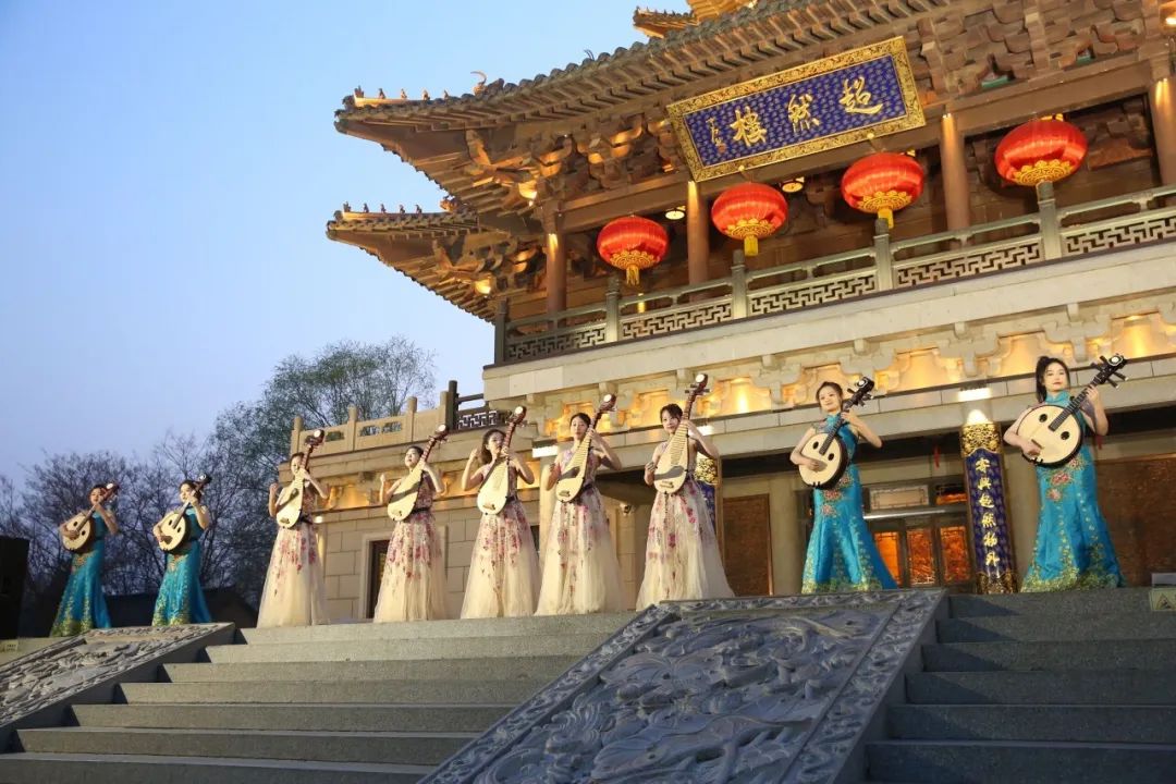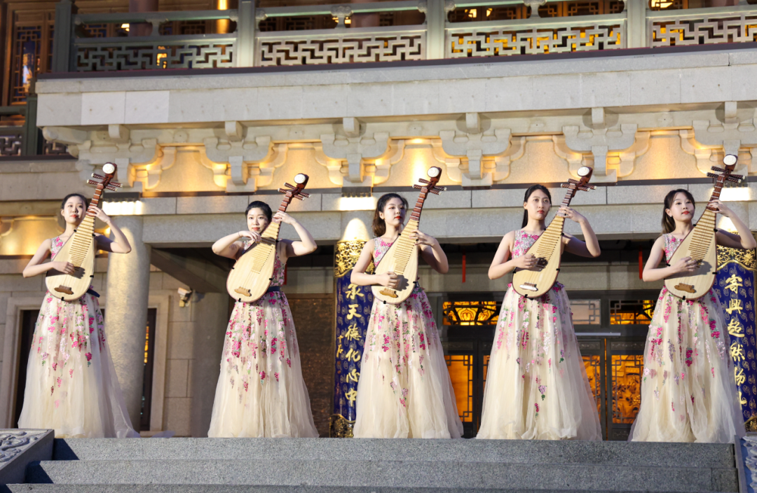 而就在此時,超然樓中十位漢服仙子翩然而出,翩若驚鴻、婉若游龍,她們懷抱琵琶、中阮,委婉古樸的旋律隨即緩緩流淌開去,這便是彈撥樂重奏《春江花月夜》。樂曲通過流暢多變的節奏,巧妙細膩的配器,絲絲入扣的演奏,仿佛令人發生了情境穿越,恰似形象描繪了月夜明湖的迷人景色,盡情贊頌泉城人家的風姿異態,此情此景則更印證了那句“濟南瀟灑似江南”。一曲奏畢,現場再次人聲鼎沸,不少游客都將這一絕美過程記錄下來,口中嘖嘖稱贊,“羨煞濟南山水好”,“有心常作濟南人”。