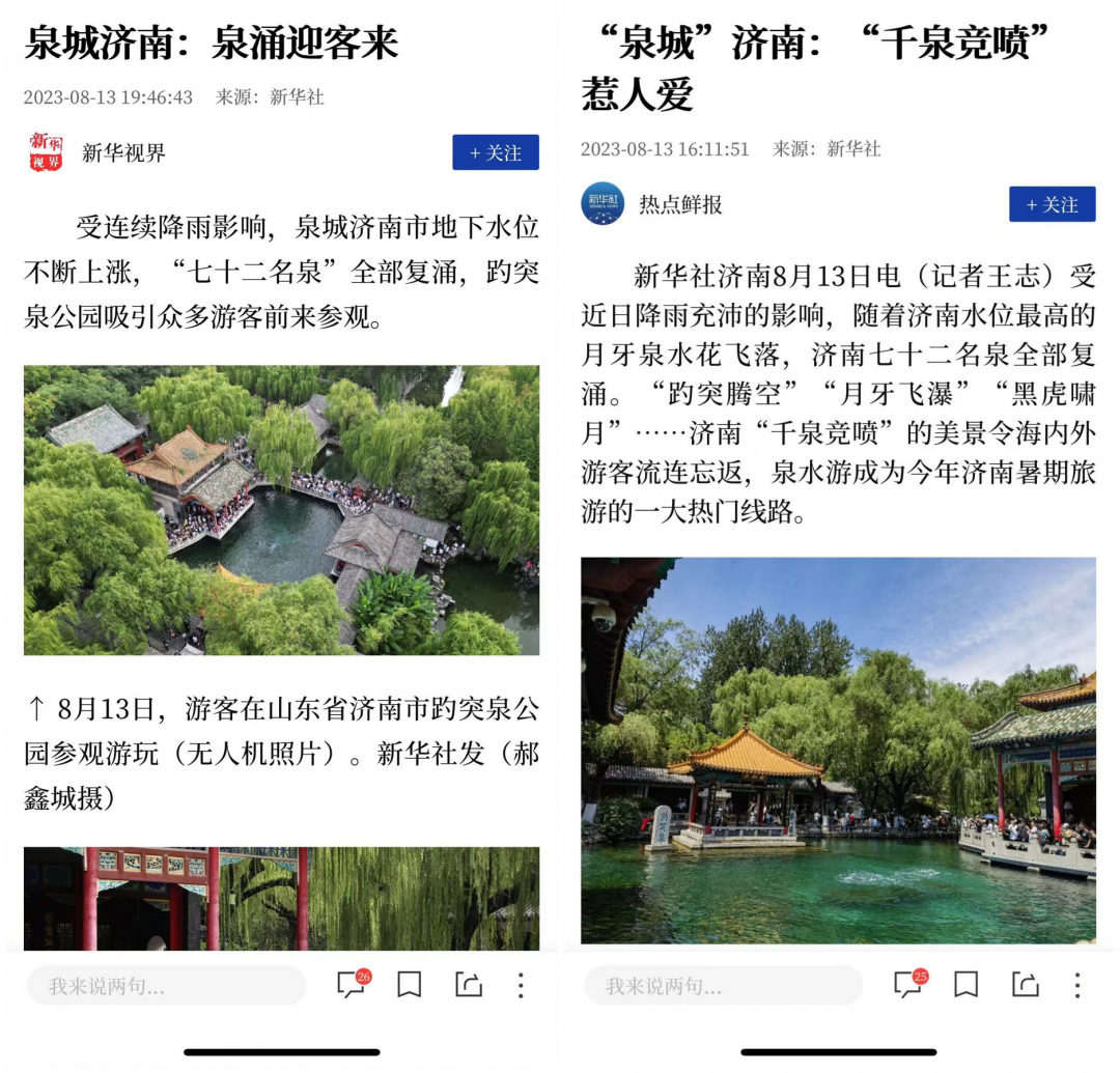 2023年8月13日,新華社連發(fā)兩稿《泉城濟(jì)南:泉涌迎客來(lái)》《“泉城”濟(jì)南:“千泉競(jìng)噴”惹人愛(ài)》,著重報(bào)道天下第一泉風(fēng)景區(qū),點(diǎn)贊“泉城”濟(jì)南。文章寫(xiě)到,濟(jì)南“千泉競(jìng)噴”的美景令海內(nèi)外游客流連忘返,泉水游成為今年濟(jì)南暑期旅游的一大熱門線路。如下為稿件詳情——